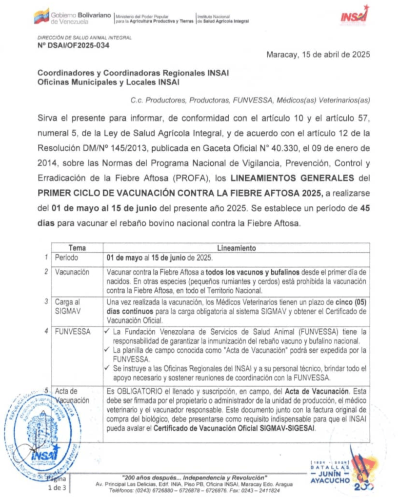 La Dirección Nacional de Salud Animal del INSAI publicó los lineamientos para el próximo Ciclo de Vacunación contra la Fiebre Aftosa.