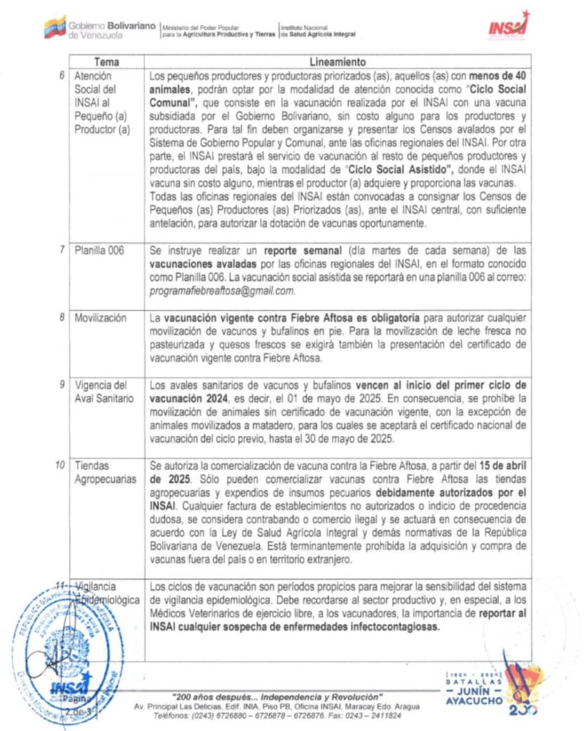 - Ejecutar la vacunación contra la Fiebre Aftosa y otras establecidas por el Insai, según el Plan Operativo de Vacunación y eventuales adendas aprobado por las autoridades competentes, para cada una de las zonas programadas.