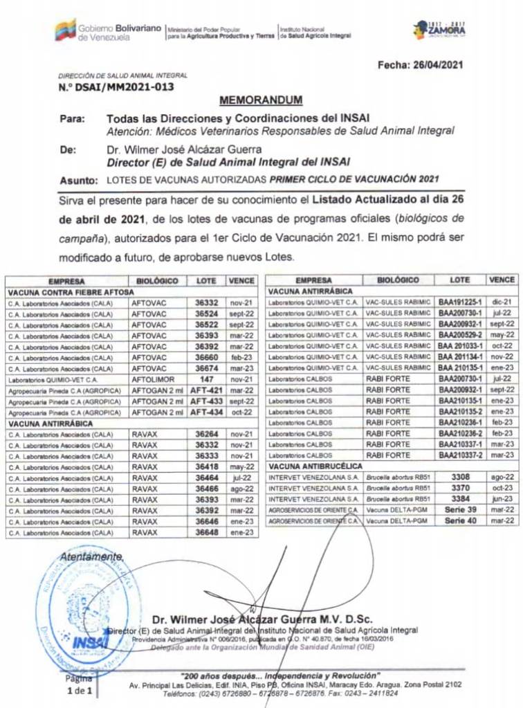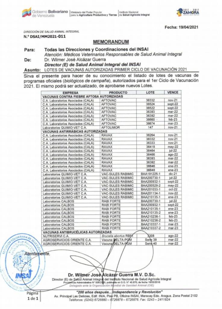 Para el I Ciclo de Vacunación del 2021, el INSAI publicó dos listados con los lotes de biológicos autorizados para la Fiebre Aftosa, la Rabia y la Brucelosis.